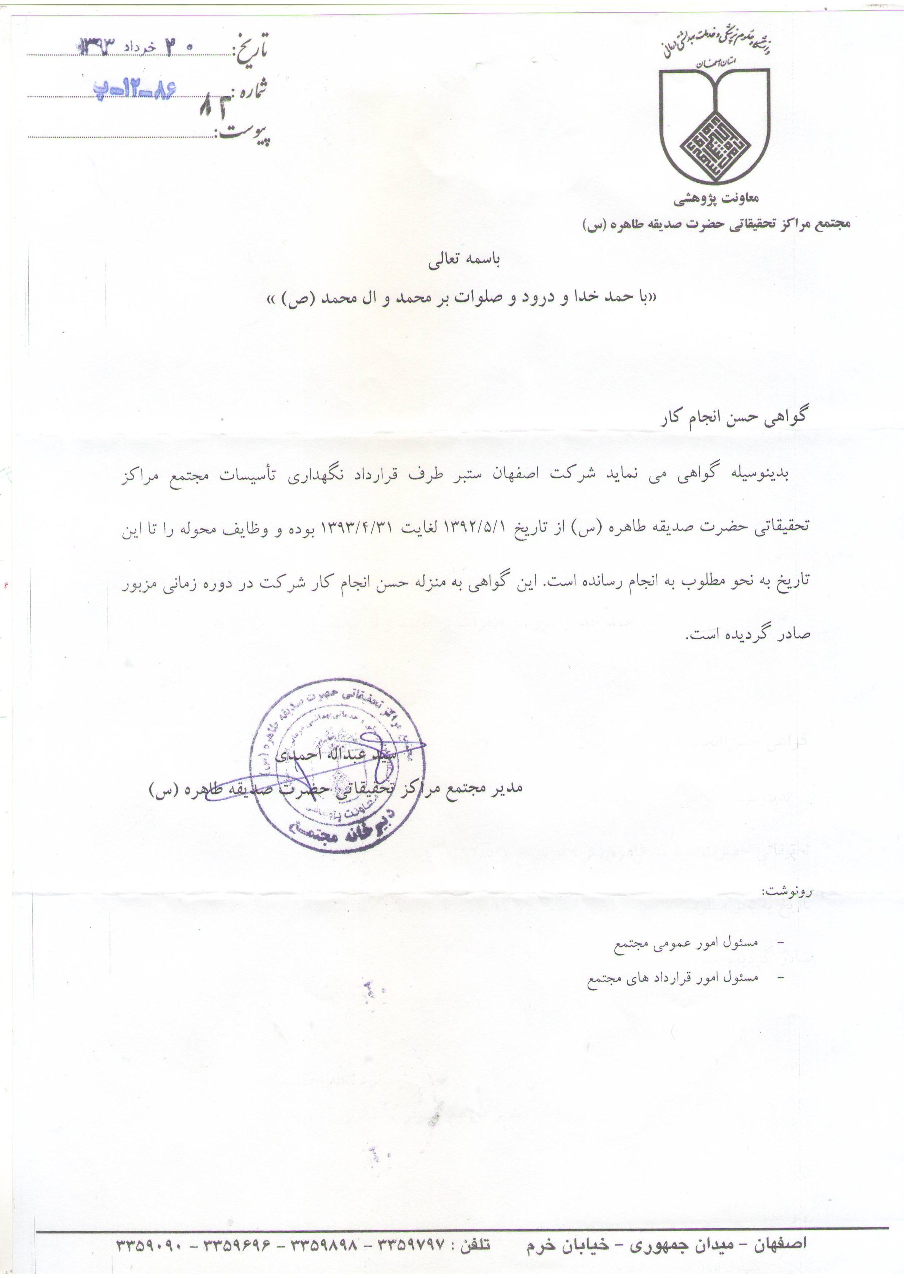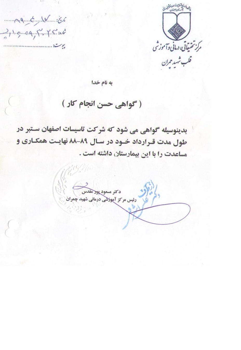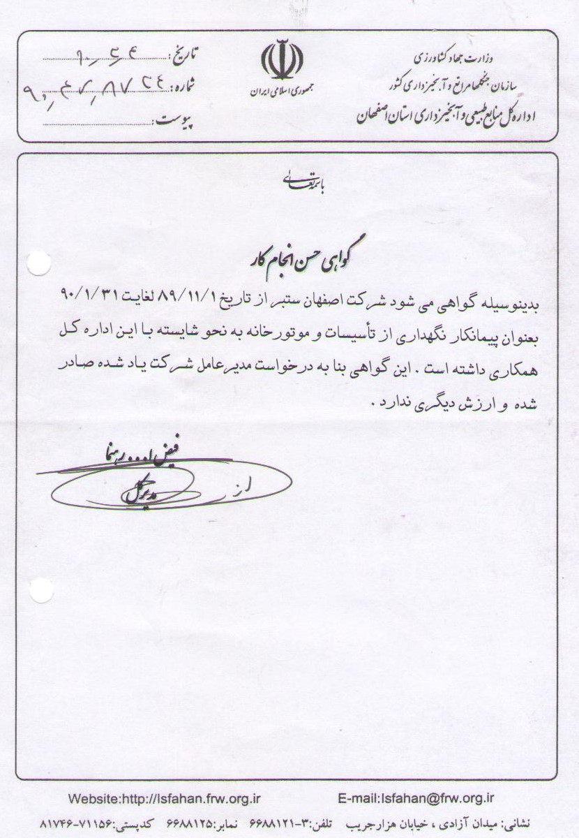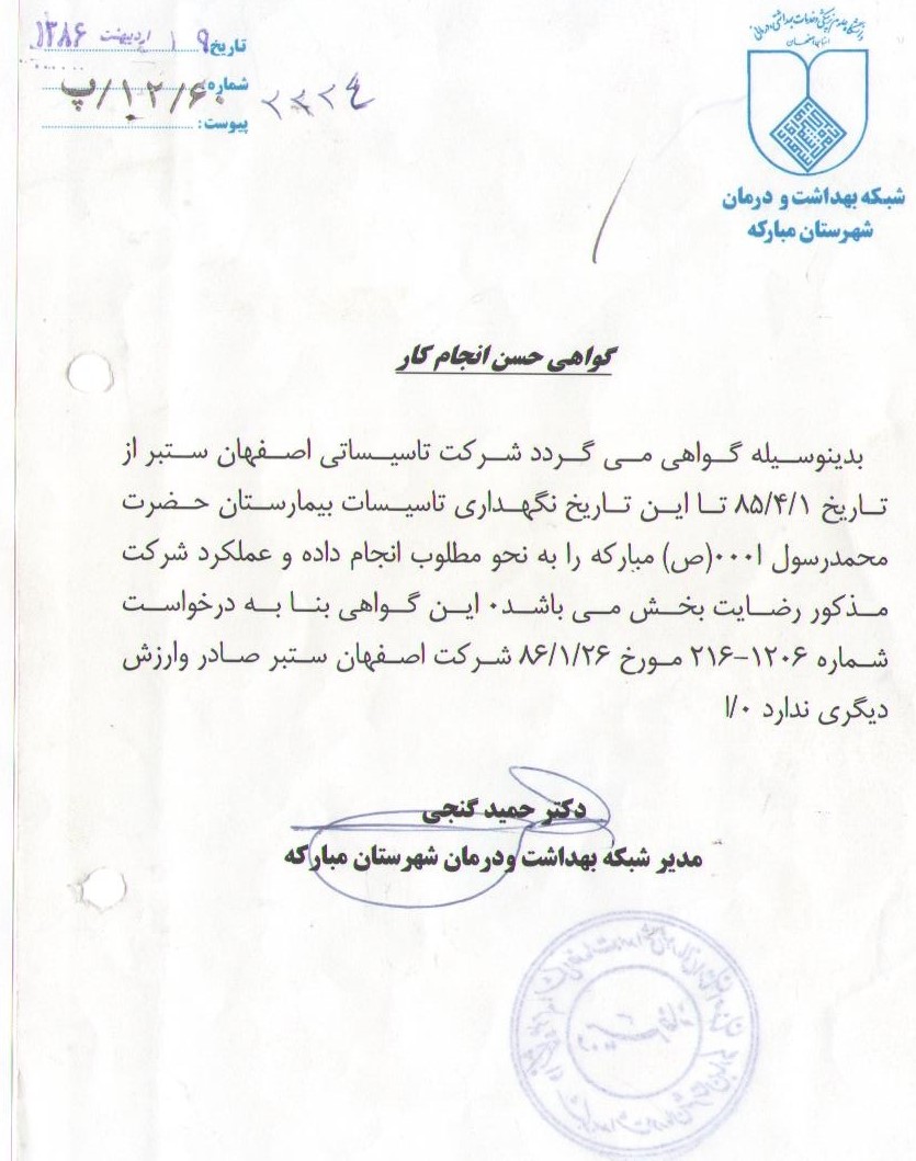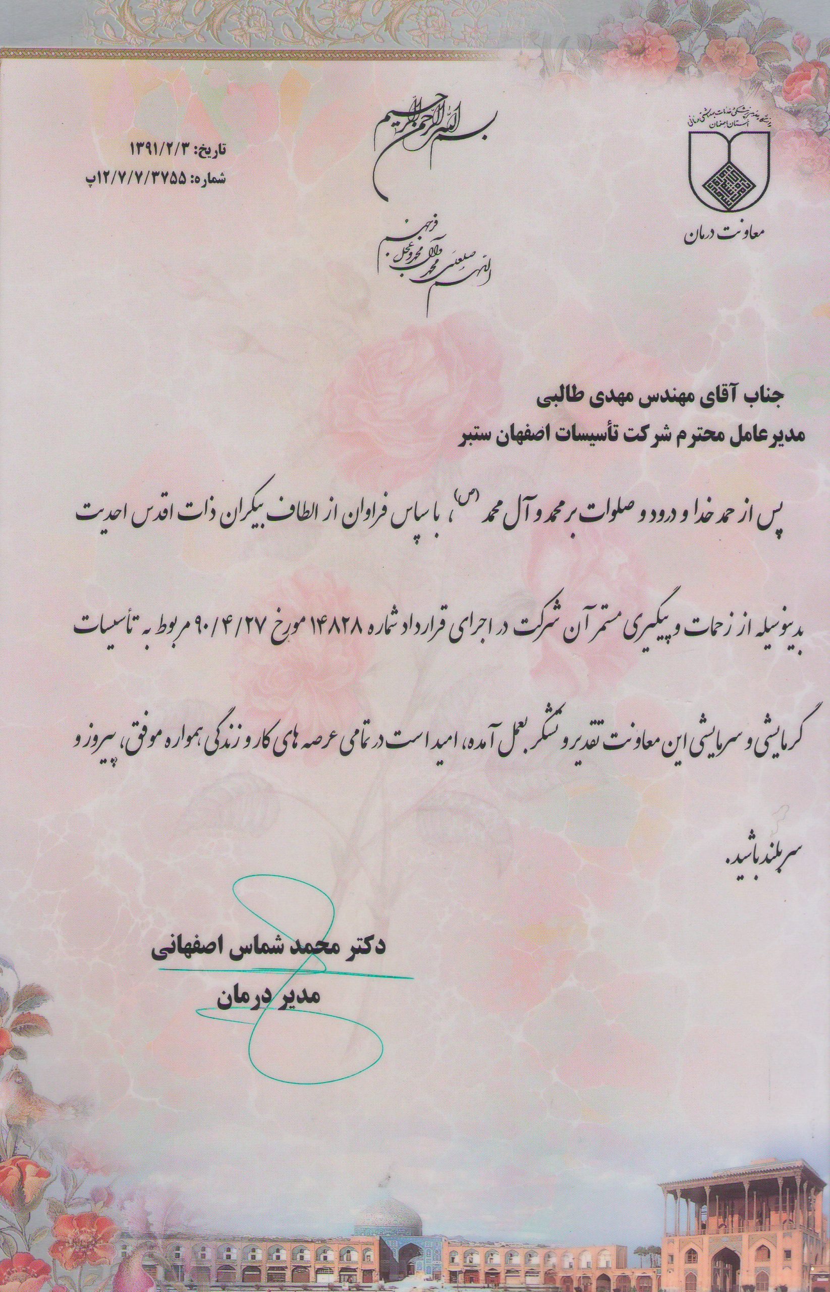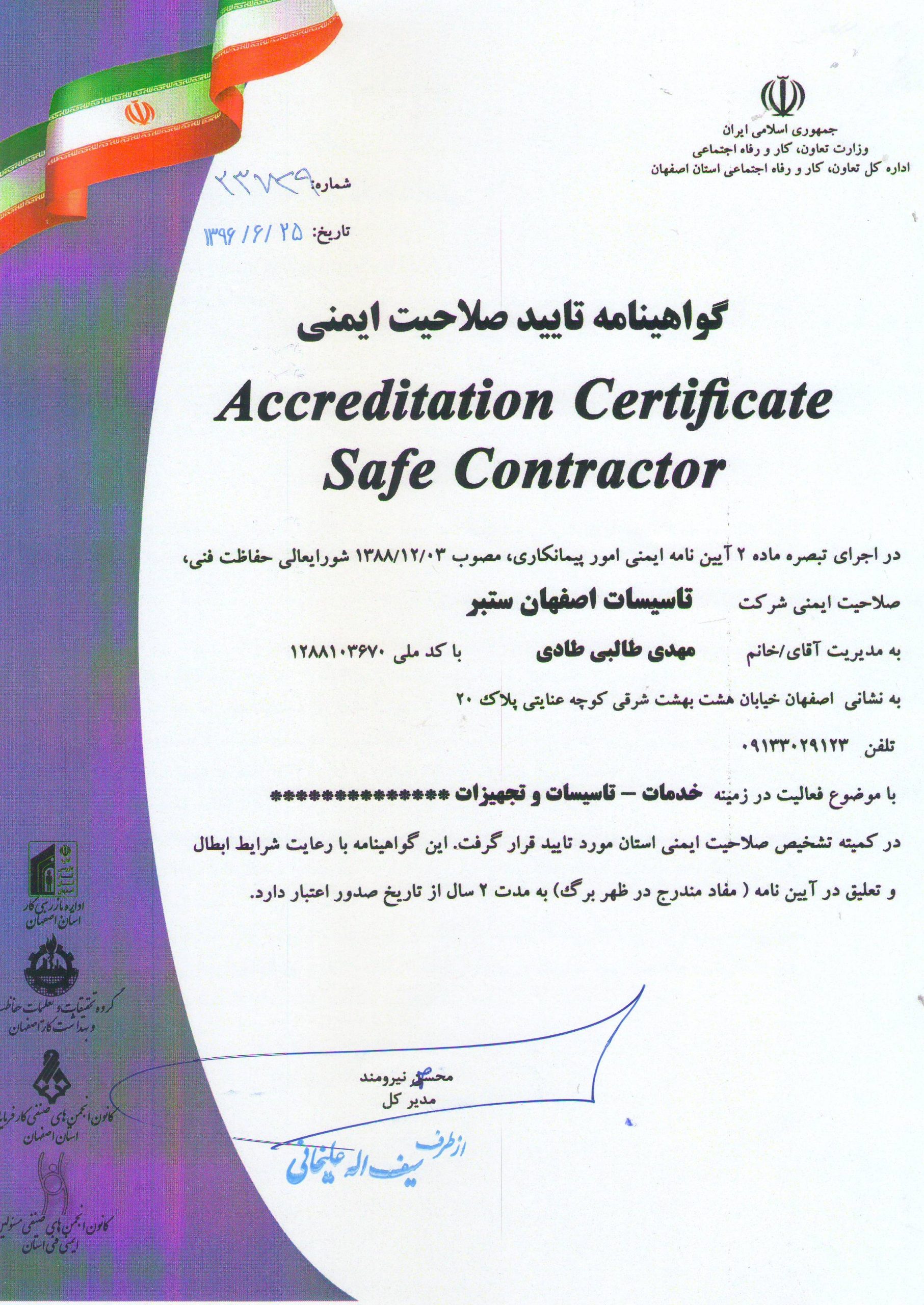 - عضوانجمن صنفی شرکتهای تاسیساتی وساختمانی استان اصفهاندارای کدگازرسانی ازاتحادیه تاسیسات مکانیک وسازمان نظام مهندسی استان اصفهان